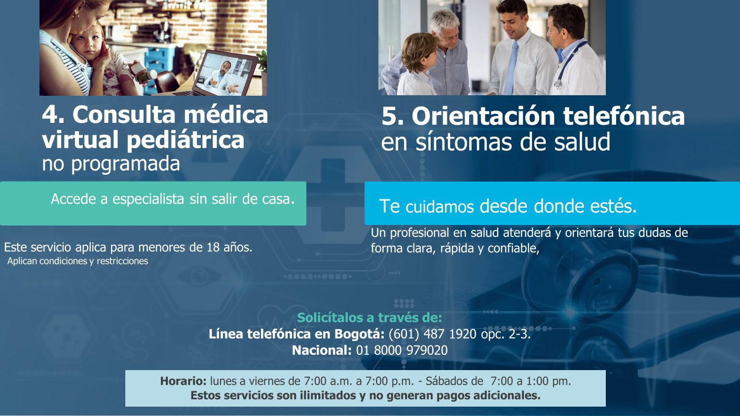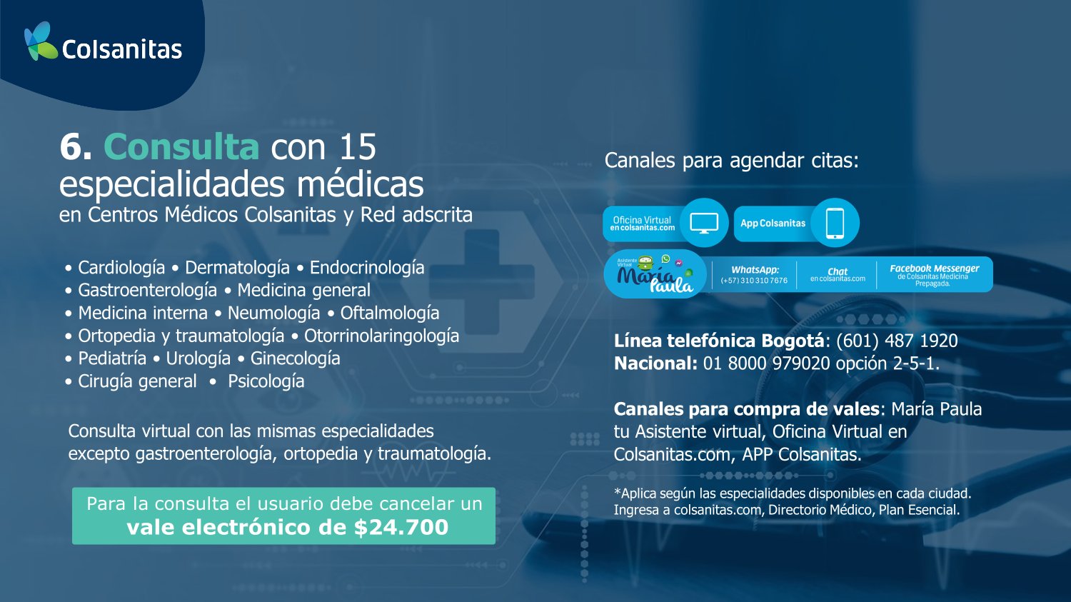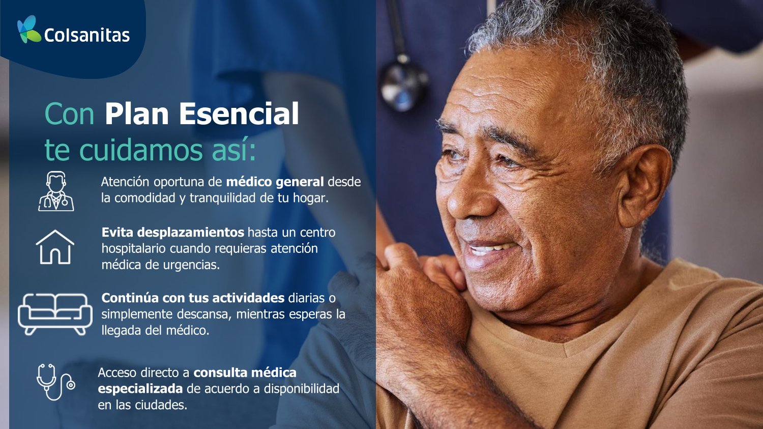 Cuida tu salud sin salir de casa. Con plan esencial tendrás atención médica de calidad en la puerta de tu hogar, cuando más lo necesites, también consulta con 15 especialidades de forma directa y mucho mas. Tranquilidad y bienestar para ti y tu familia. Desde 41.900 mensuales